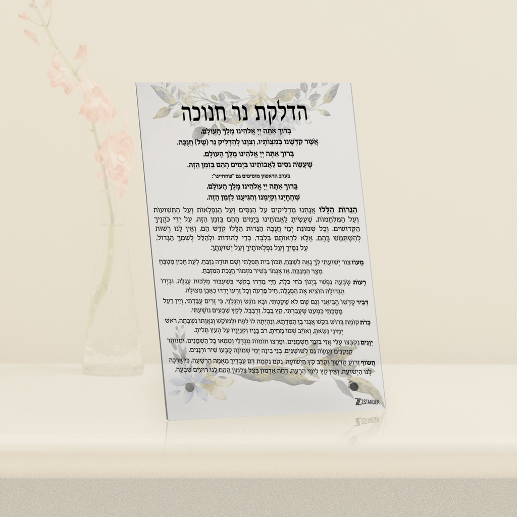 This classic Chanuka brachos plaque spells class. This floral plaque with black text is the perfect enhancement for your Menorah tray.